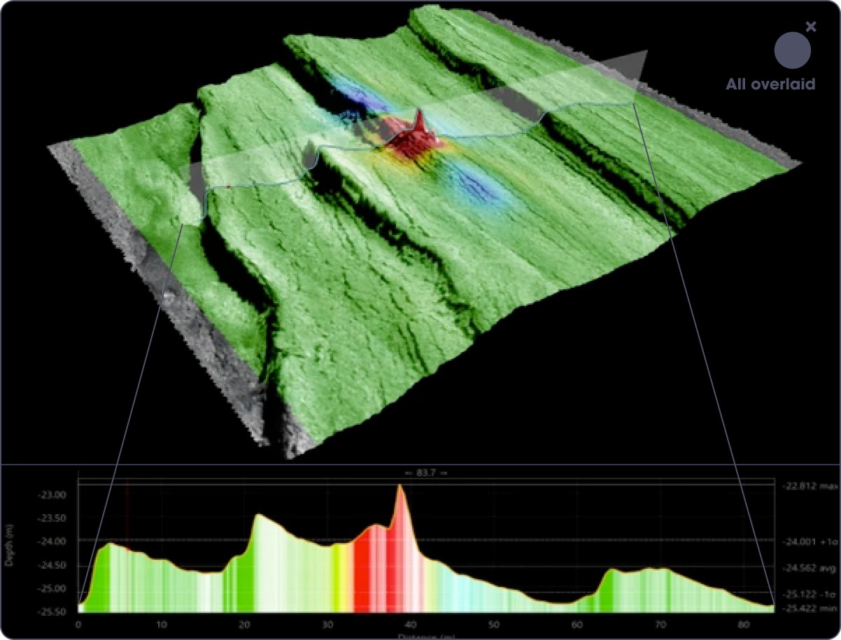 Our goal for this field test was thorough data collection around a cluster of two anchors in this region, aiming to demonstrate Bedrock's ability to accurately detect and map specific underwater features. The game plan was straightforward: using Bedrock’s custom survey planning tool, plan and map a 100 x 100 m area in a systematic lawnmower pattern, with our AUV cruising at a steady 9 m above the seabed. All told, the test took about 20 minutes to complete, but we could happily stare at the resulting data for hours!