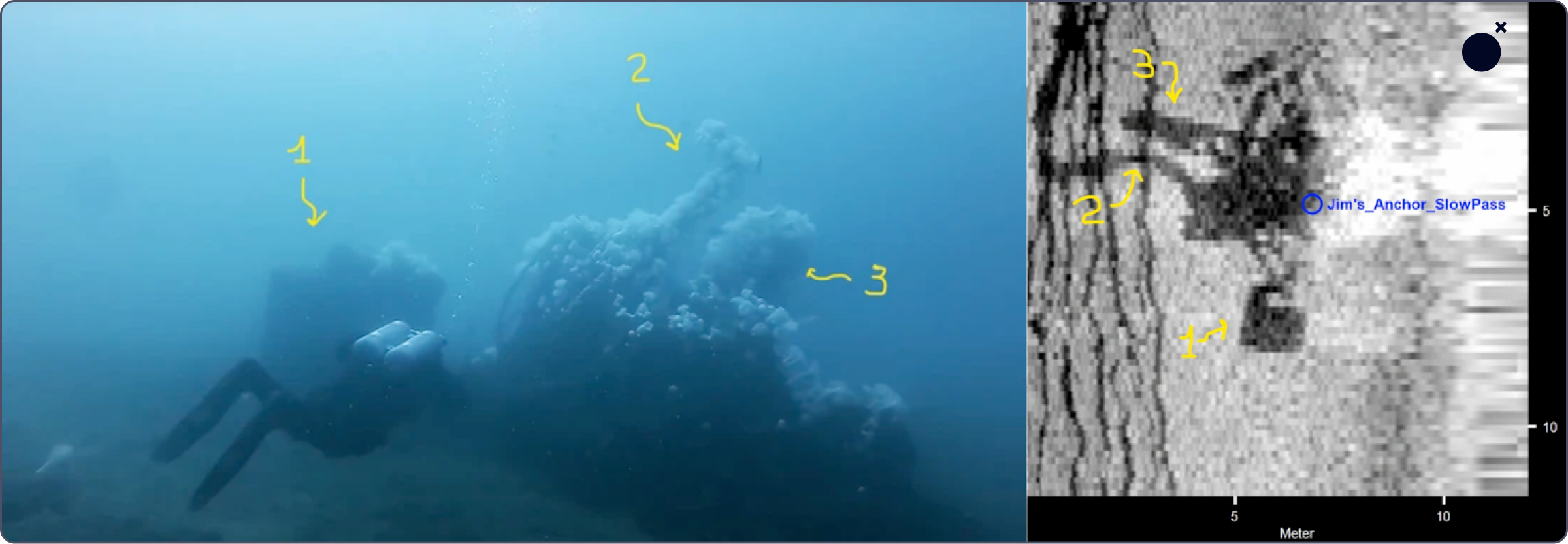 Figure 5. Imagery taken from video collected by local scuba divers (left) as compared to side-scan sonar imagery (right), with interpretation overlain supporting the presence of three distinct anthropogenic structures on the seabed.