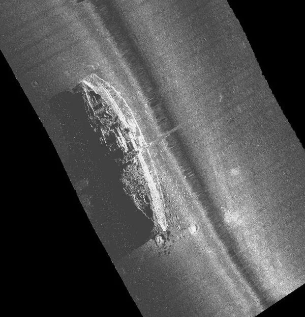 Side scan sonar image of the Steamship Portland, which sunk into the ocean off the coast of New England in 1898. via NOAA